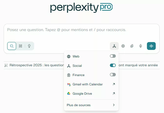Bonus n°1 : Allez … comme on est entre nous, je t’offre LE tip sur Perplexity : l’option de recherche « sociale« , qui va fouiner dans Reddit et dans X pour te remonter ce que dit concrètement ton audience dans les discussions et les forums (pain point, vocabulaire, tendances), et ça … ça n’a pas de prix ! (imagine pour les études de marché …)
