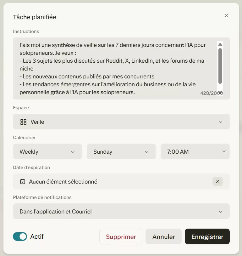 Bonne nouvelle : les tâches planifiées sont accessibles dès le plan gratuit. Tu configures ton digest une seule fois, tourne ensuite tout seul et arrive dans ta boîte mail chaque vendredi sans que tu aies à y penser.